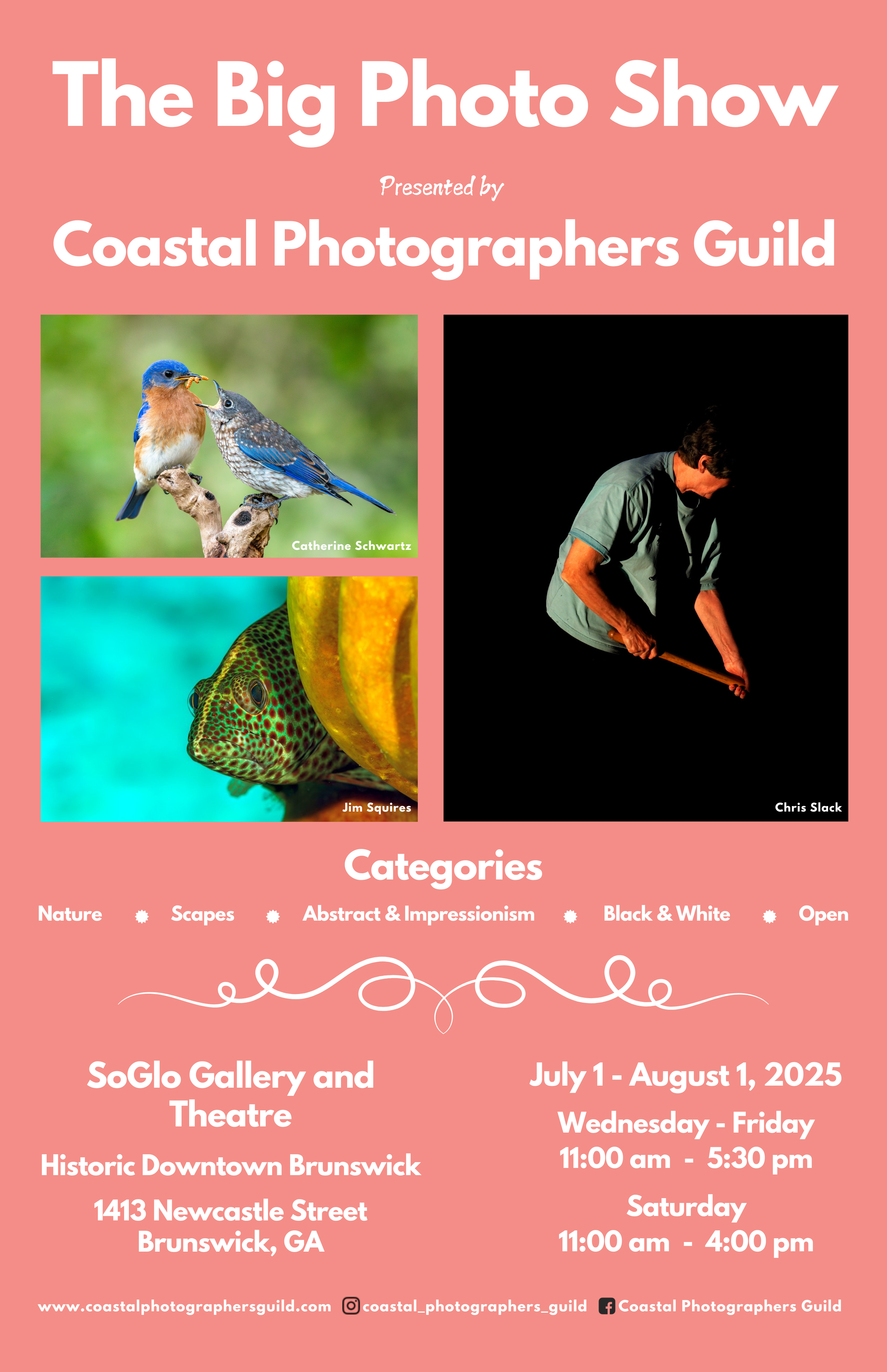 SoGlo Gallery/Theatre, located at 1413 Newcastle Street in Brunswick, is open weekly Wednesday – Friday, 11-5:30 and Saturday, 11-4, and by appointment (912) 230-1042. The Gallery will be open during the First Fridays in July and August as well as First Thursday Art Walk on July 3rd. We are holding our Grand Opening for the public on Thursday, July 3 in coordination with the Art Walk.
