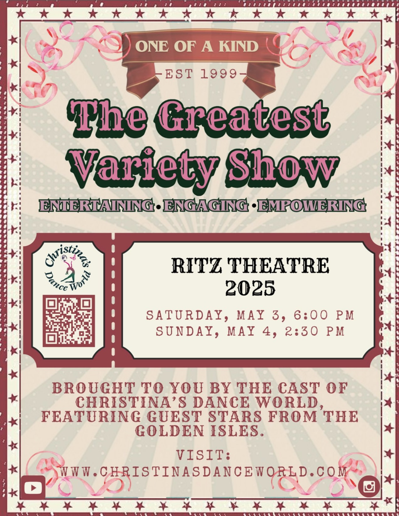 Entertaining, engaging and empowering! RITZ THEATRE Brought to you by the cast of Christina’s dance world featuring guest stars from the golden isles! Dancers, singers, performances!! Art!!