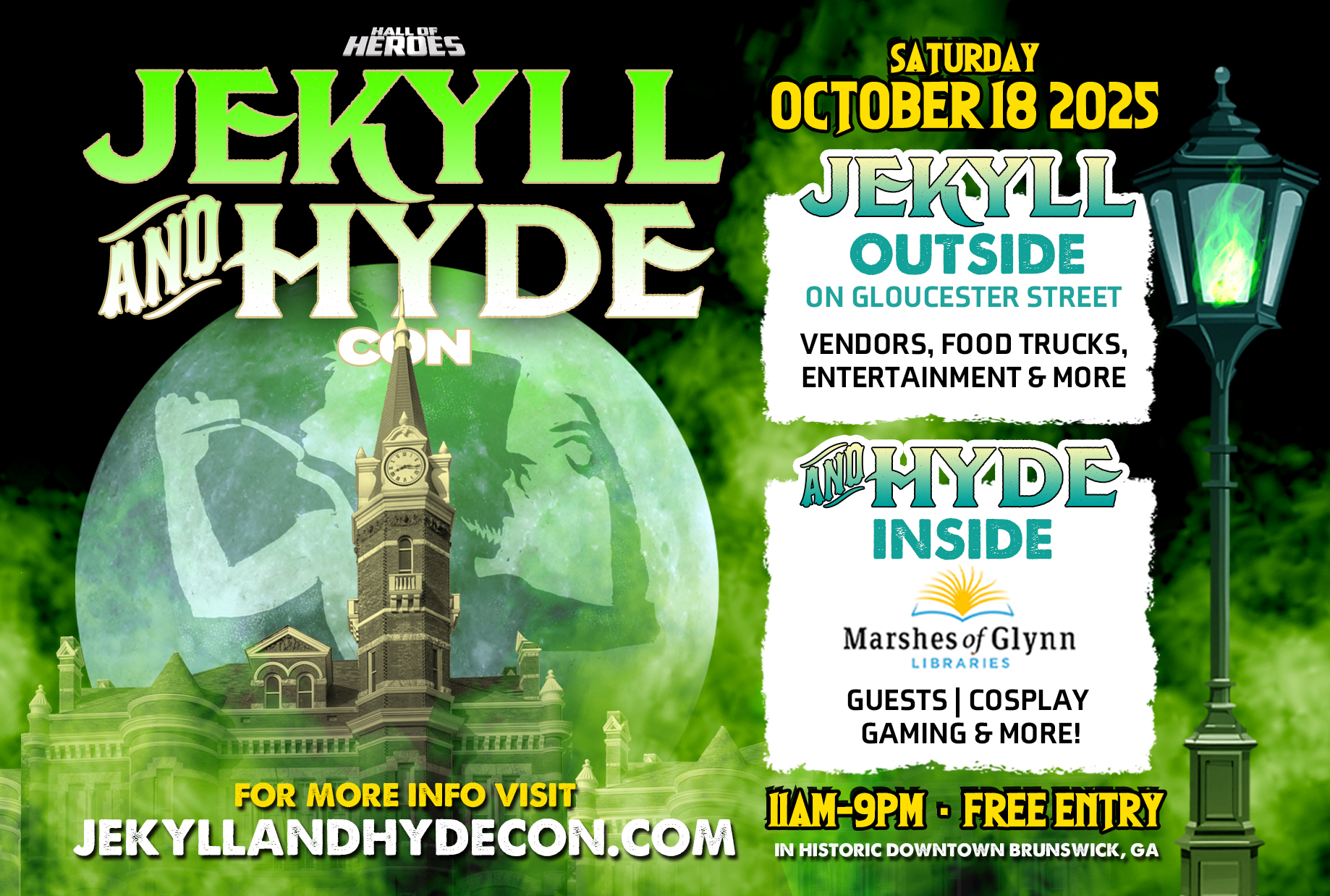 Jekyll and Hyde Con Saturday October 18th, 2025 in Historic Downtown Brunswick, GA In cooperation with Discover Brunswick the show will take over the Marshes of Glynn Library and Gloucester St between Newcastle and Bay featuring street vending, special guests, performances, contests, and more! This event will be FREE to the public! 11 AM - […]