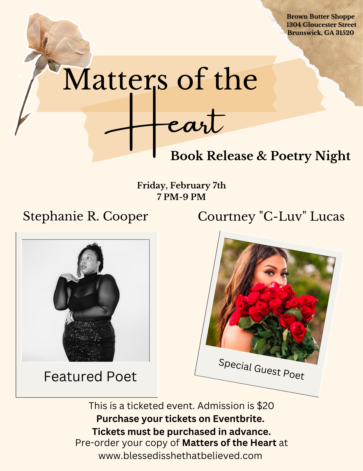 Join Stephanie R. Cooper for the debut of her newest book, Matters of the Heart: A Collection of Poetry and her special guest, Courtney “C-Luv” Lucas for a wonderful night of poetry, love, and sweets. Cakique will be in the house with delectable desserts, and of course shop from the different vendors in the Brown Butter Shoppe